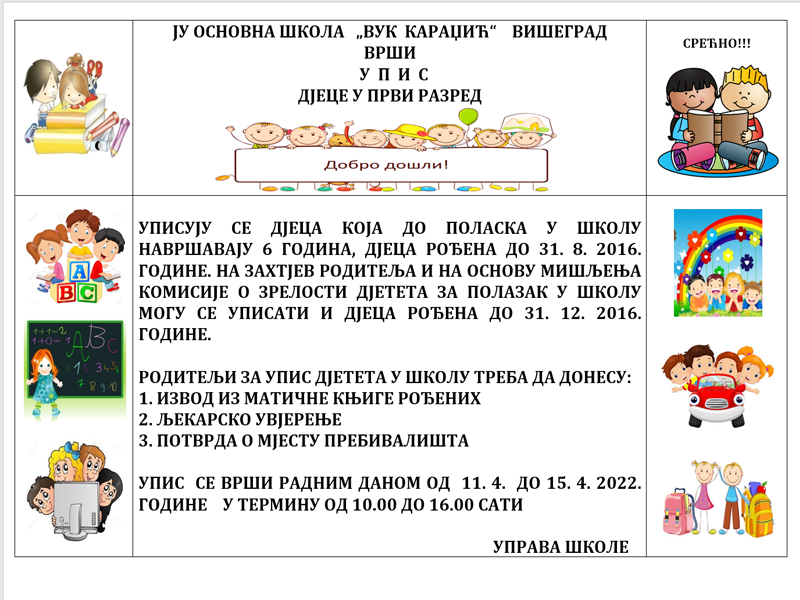 ЈУ основна школа „Вук Караџић“ Вишеград, врши упис дјеце у први разред.